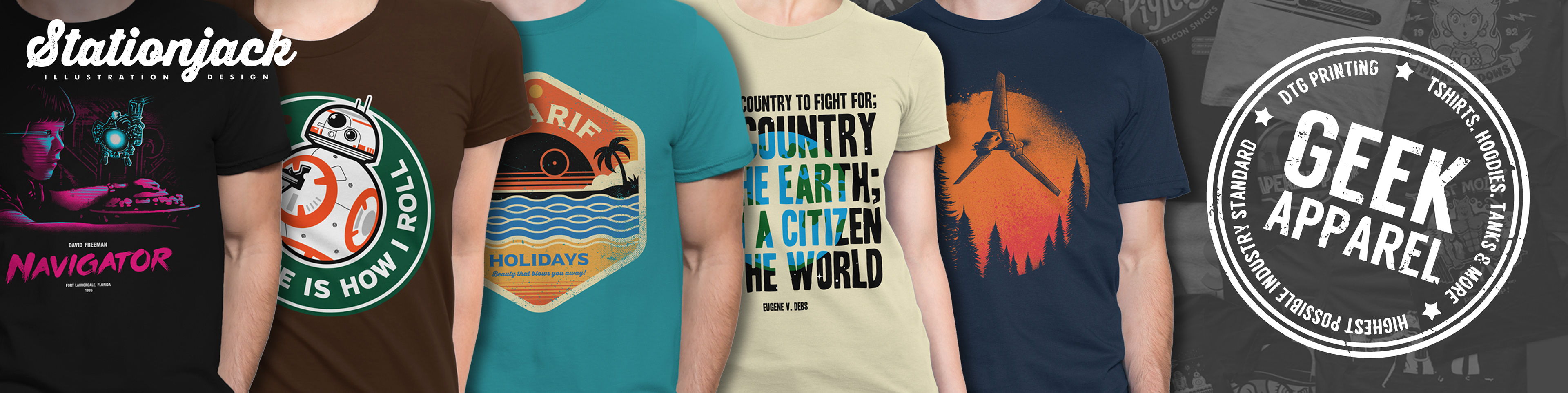 Hello there, my name is Martyn (aka Stationjack) and I'm a freelance artist. I mainly like to design pop culture, geeky, nostalgic t-shirts. I am heavily influenced by my childhood, films, television, retro gaming, music. I had to quit my previous job because of a chronic pain condition. I was no longer able to do physical jobs or jobs that required long periods of sitting or standing, so it's been pretty tough. I have been trying to support myself through my art for the last few years. I have had my work featured on a number of daily t-shirt sites such as TeeFury, Ript Apparel, Qwertee, Shirt Punch, Othertees and others. I'm also available for freelance work so if you like my style and would like to work with me please get in touch. I hope people enjoy my designs.