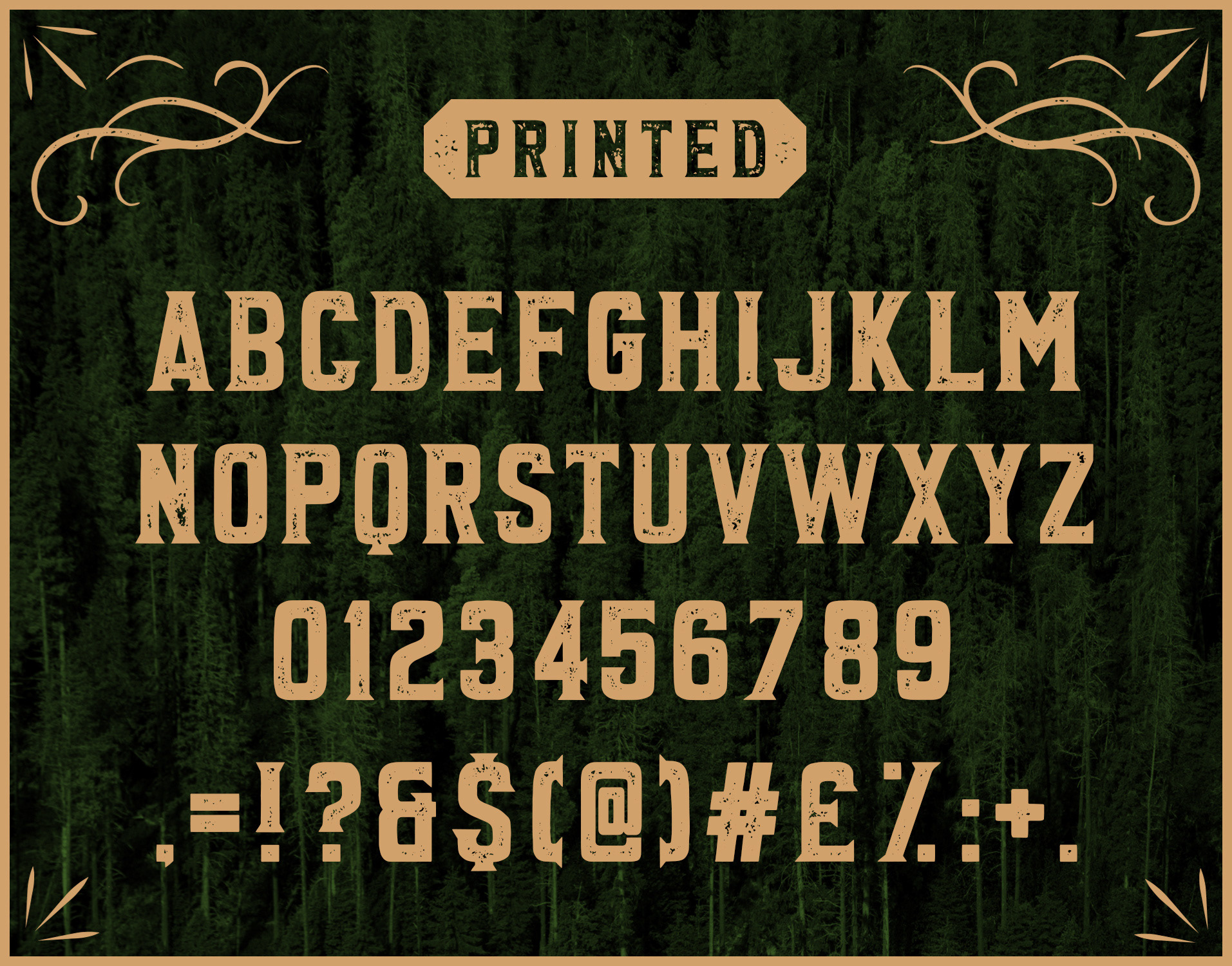This font has 2 styles including Regular and Printed. All fonts come with upper case letters, numbers and a selection of punctuation.